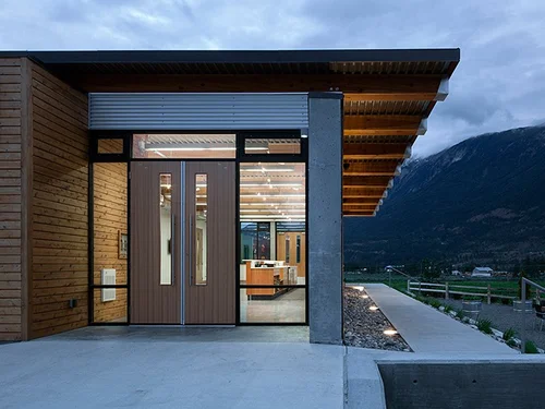 The East courtyard façade features two new metal canopies which serve to define the entryway and the newly landscaped courtyard space.