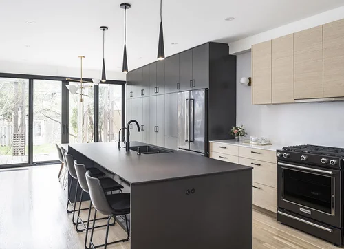A modern kitchen was designed with clean lines, including access to the basement which is concealed in the millwork.
