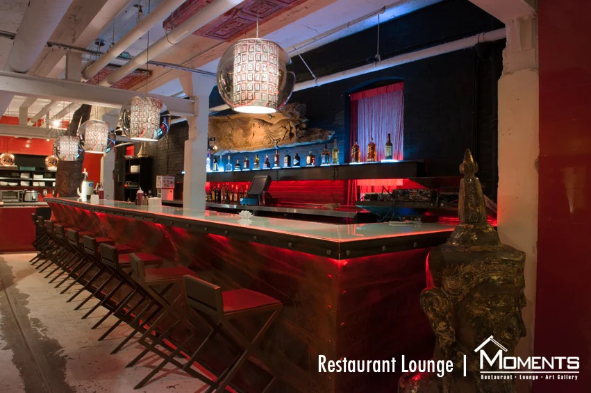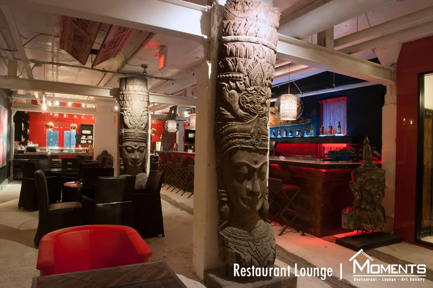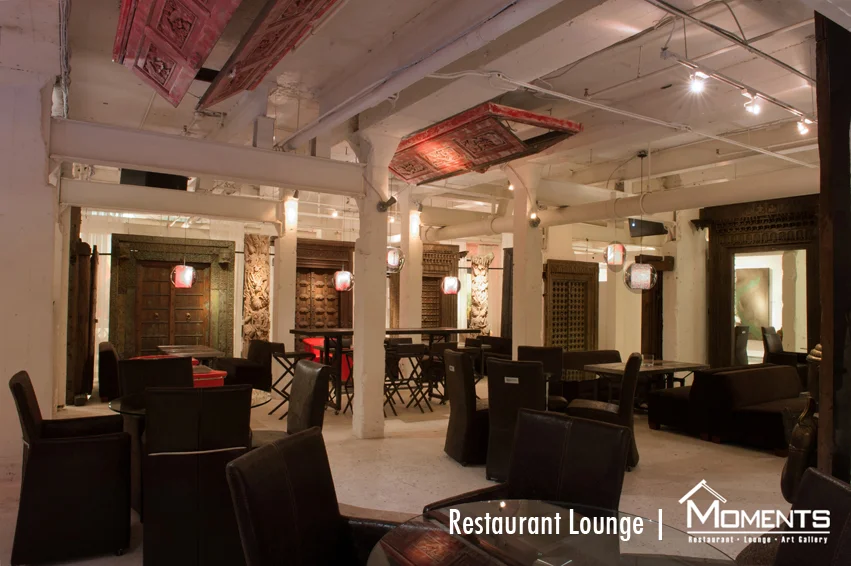 While the vast space could have easily ended up feeling cold and cavernous, the industrial concrete box is surprisingly warm, even cozy, with rearrangeable room dividers, intimate seating areas and glowing pink and red lighting. Sixteen hand-carved 17th-century doors from Jaipur create passageways through the space. There’s also a rail running through the floor—a vestige of its industrial past—and everything is on wheels: custom tables and comfortable chairs all roll smoothly over the bare cement floor.