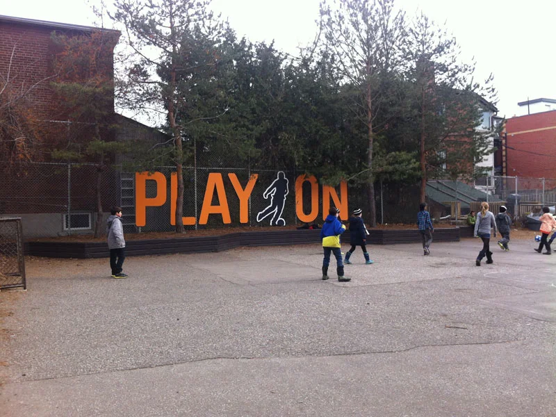In the early days after Mr. Nathan's passing a friend and mother sent me photos she had taken of him and there was one of him playing soccer with the kids in the sideyard. An idea began to form, a way for us to be greeted by him every morning in this space, his favourite space. I made a series of designs with his figure and the words Play On and sent it to Mrs Peterson as an idea. I didn't really expect it to go anywhere, I guess spending time designing this, tracing photographs and thinking of colors and shapes and how to mount it on the fence was my way of dealing with the grief. But days later I got a message from her saying "I love it, We've got to do this!" I am so thrilled that this was able to happen and I want to thank Mrs Peterson and the teachers at Garden who supported this. I also want to thank Mike Verity for so kindly helping with the installation.