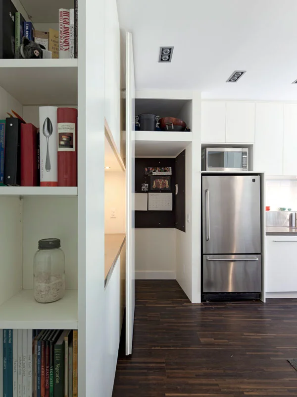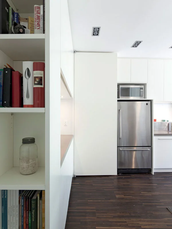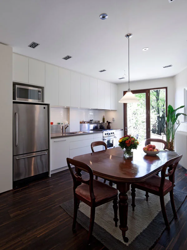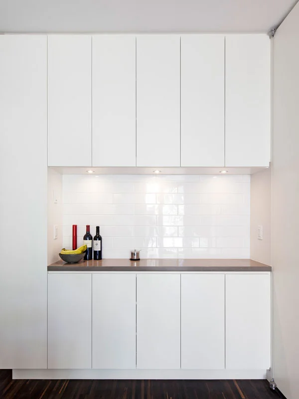 The outdated kitchen functioned poorly, lacked views to the backyard and captured very little of the natural light. The owners desired as much light as possible as well as a landscaped deck with seating to enjoy private space. The solution was custom designed windows featuring an oversized door in mahogany, providing views to the inviting, newly constructed backyard retreat. A modern kitchen was designed with clean lines, including access to the basement which is concealed in the millwork.
